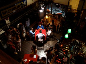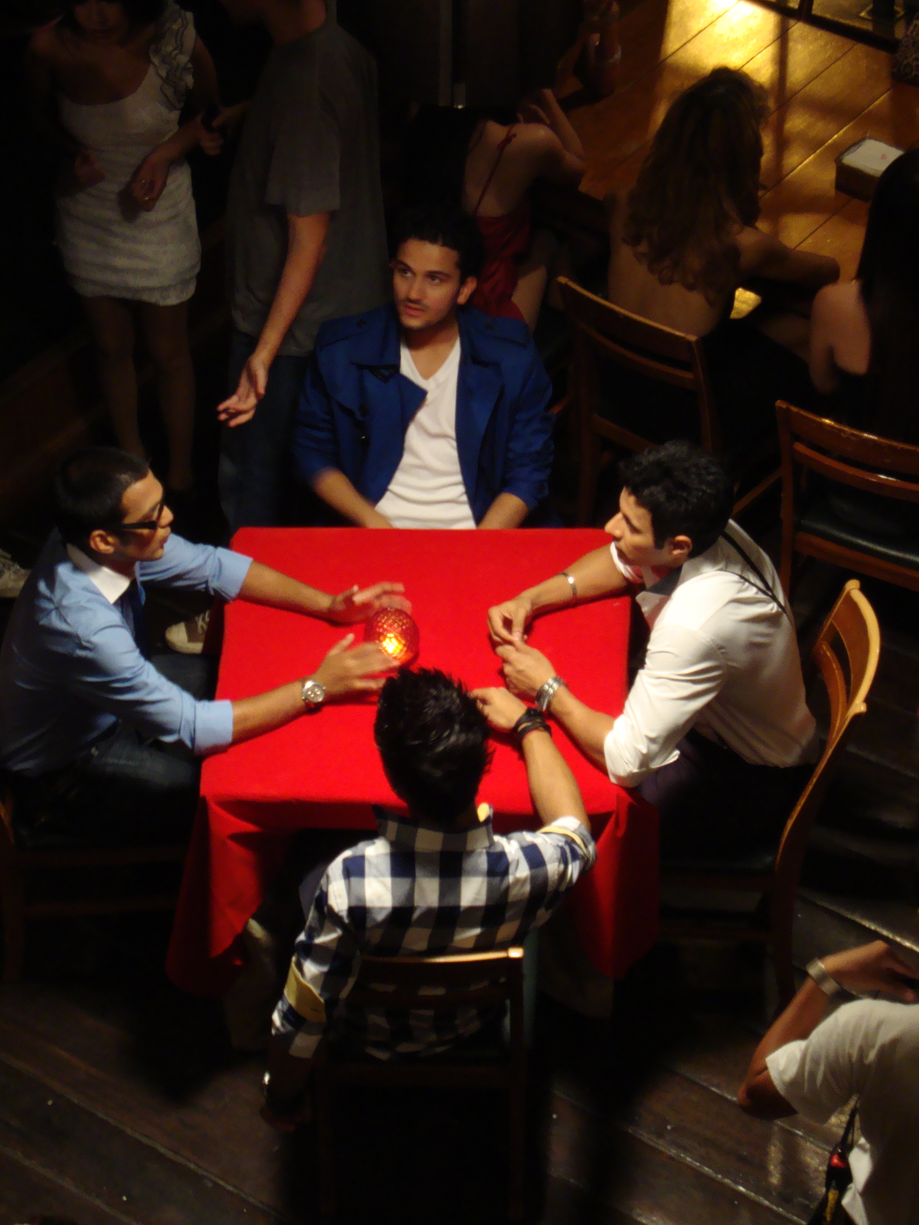 We meet the four lucky men at the Witches’ Tavern, a bustling pub dominated by a large rectangular bar, which is, predictably enough, seething with skimpily clad women. They turn out to be grounded,